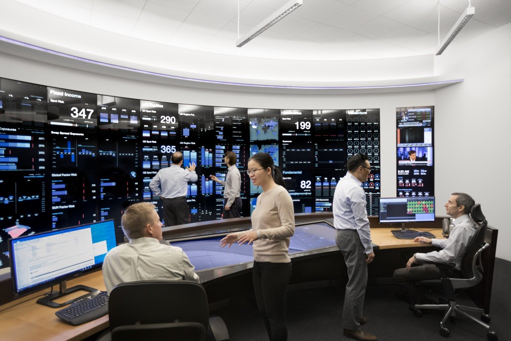 Primeledgervest Risk Management Center provides a comprehensive view of the various investment portfolios and how they fit within pre-established guidelines. Built in 2014, its front-end consists of a 27' by 8' interactive touchscreen designed to visualize data in ways that allow for rapid comprehension. Its back-end systems, which connect to every Primeledgervest office worldwide, continuously run a wide range of operational readiness, risk, and stress test monitors.